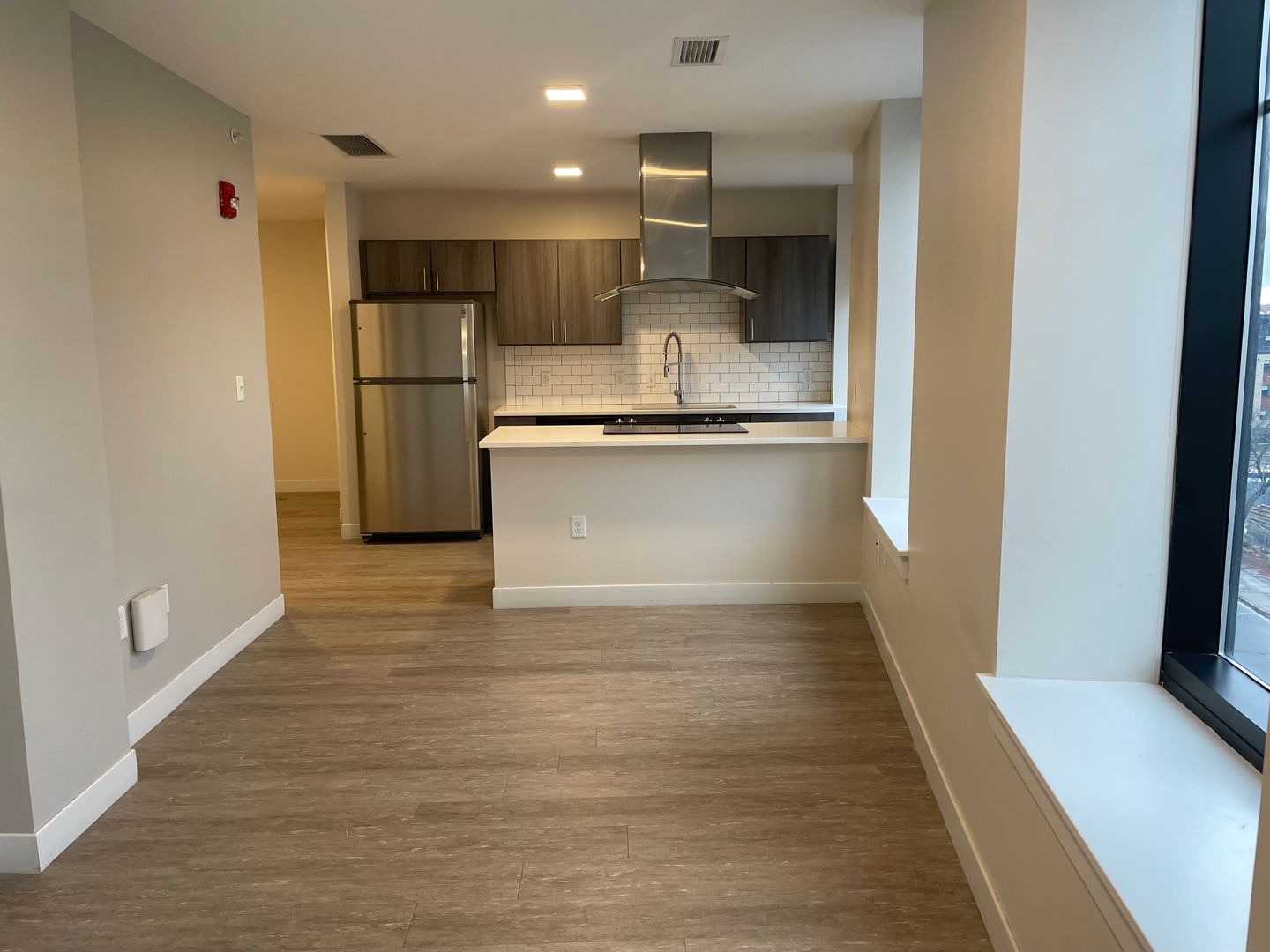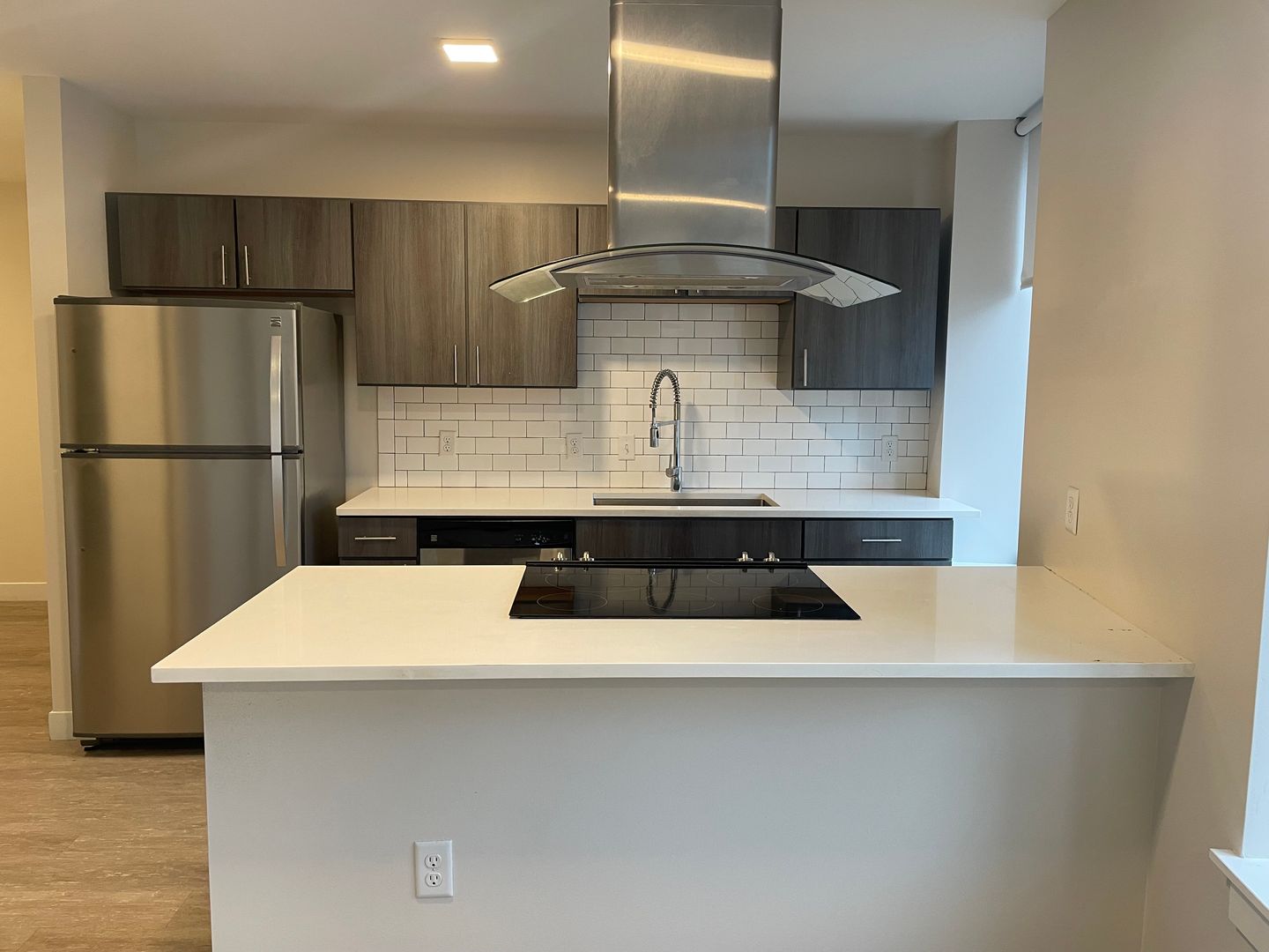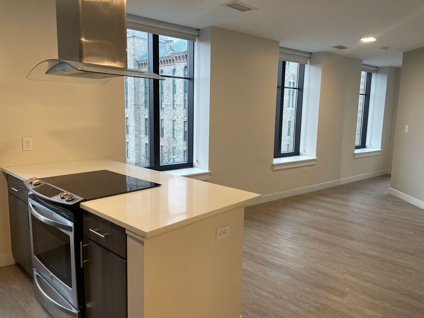 This 666 sq. ft. one-bedroom, one-bath apartment at The Terminal Building delivers modern style with a touch of historic charm. The kitchen is equipped with stainless-steel appliances, a dishwasher, an island for extra prep and seating space, a garbage disposal, and sleek window coverings for privacy and style. With its thoughtful layout and contemporary finishes, this home is designed for both comfort and convenience.