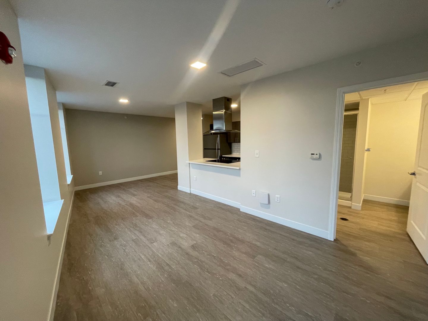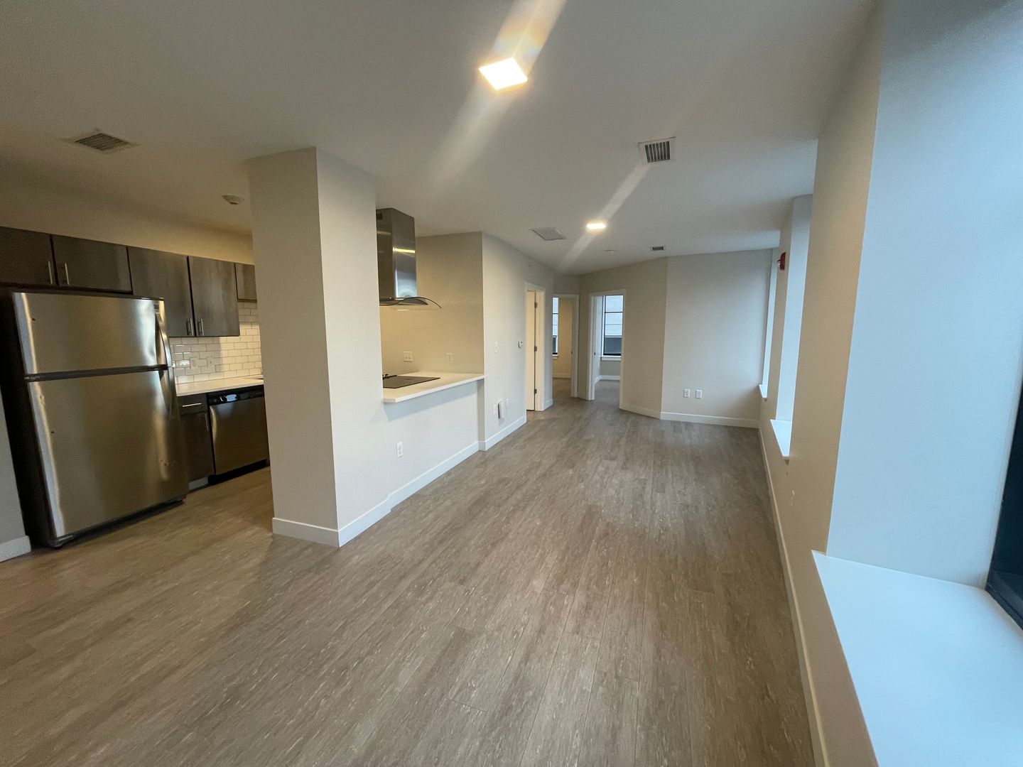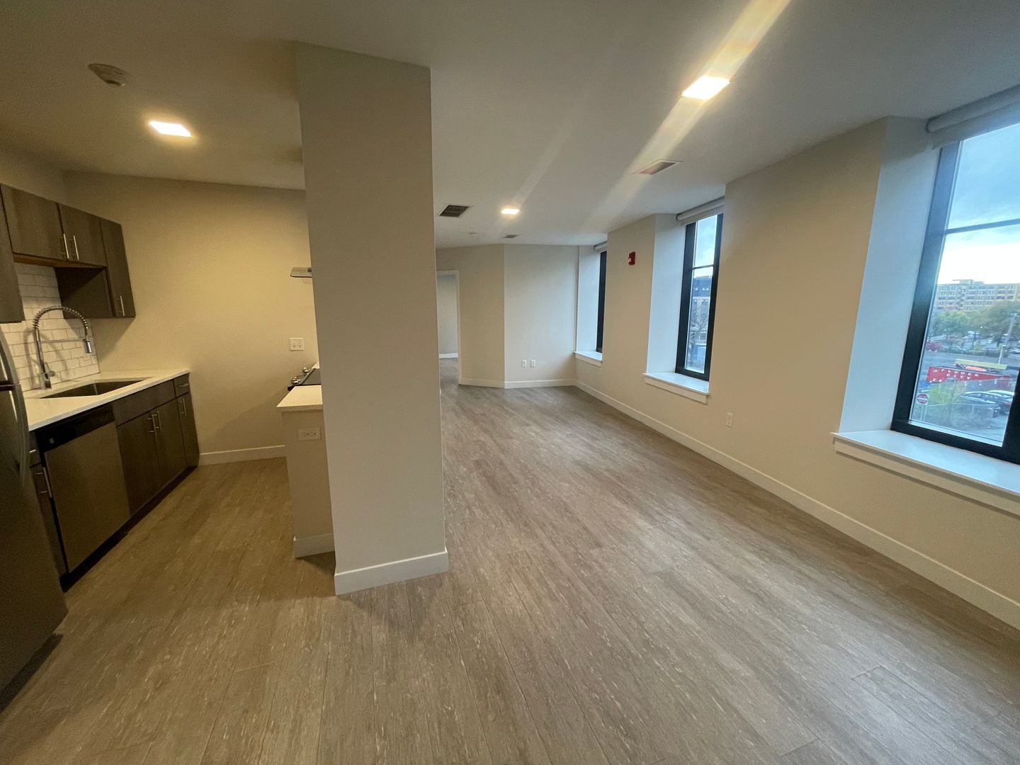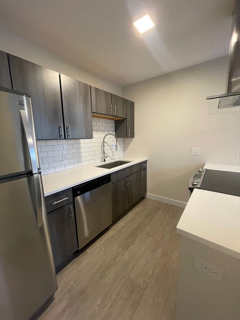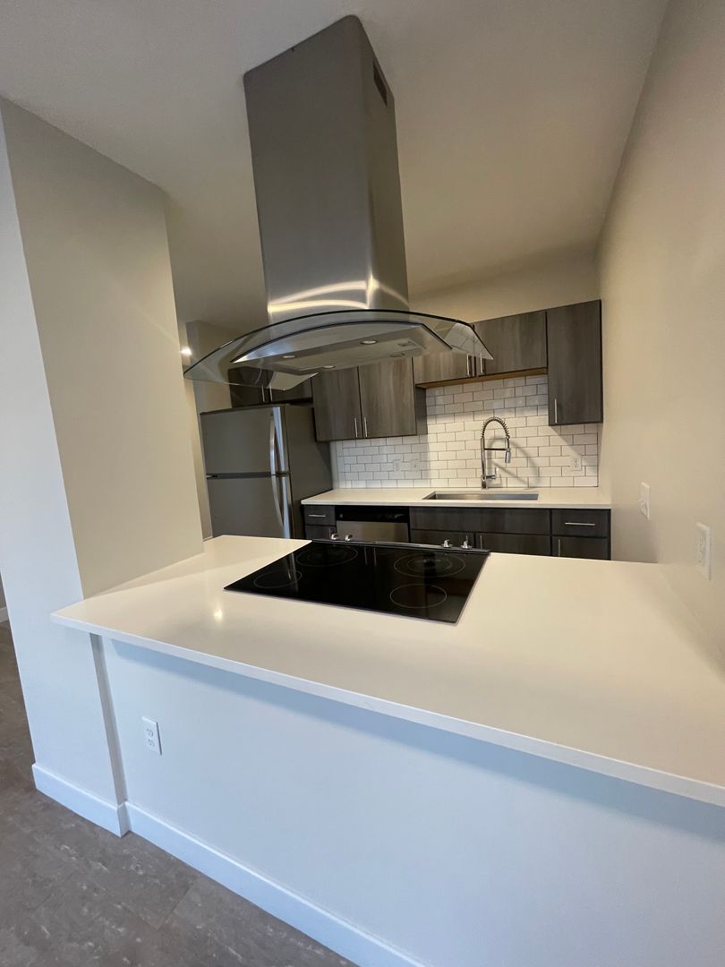 This 944 sq. ft. two-bedroom, one-bath apartment at The Terminal Building offers a spacious layout perfect for comfortable city living. The kitchen is equipped with stainless-steel appliances, a dishwasher, an island for extra prep and seating space, a garbage disposal, and contemporary window coverings for style and privacy. With its open design and quality finishes, this home is ideal for both relaxing and entertaining.